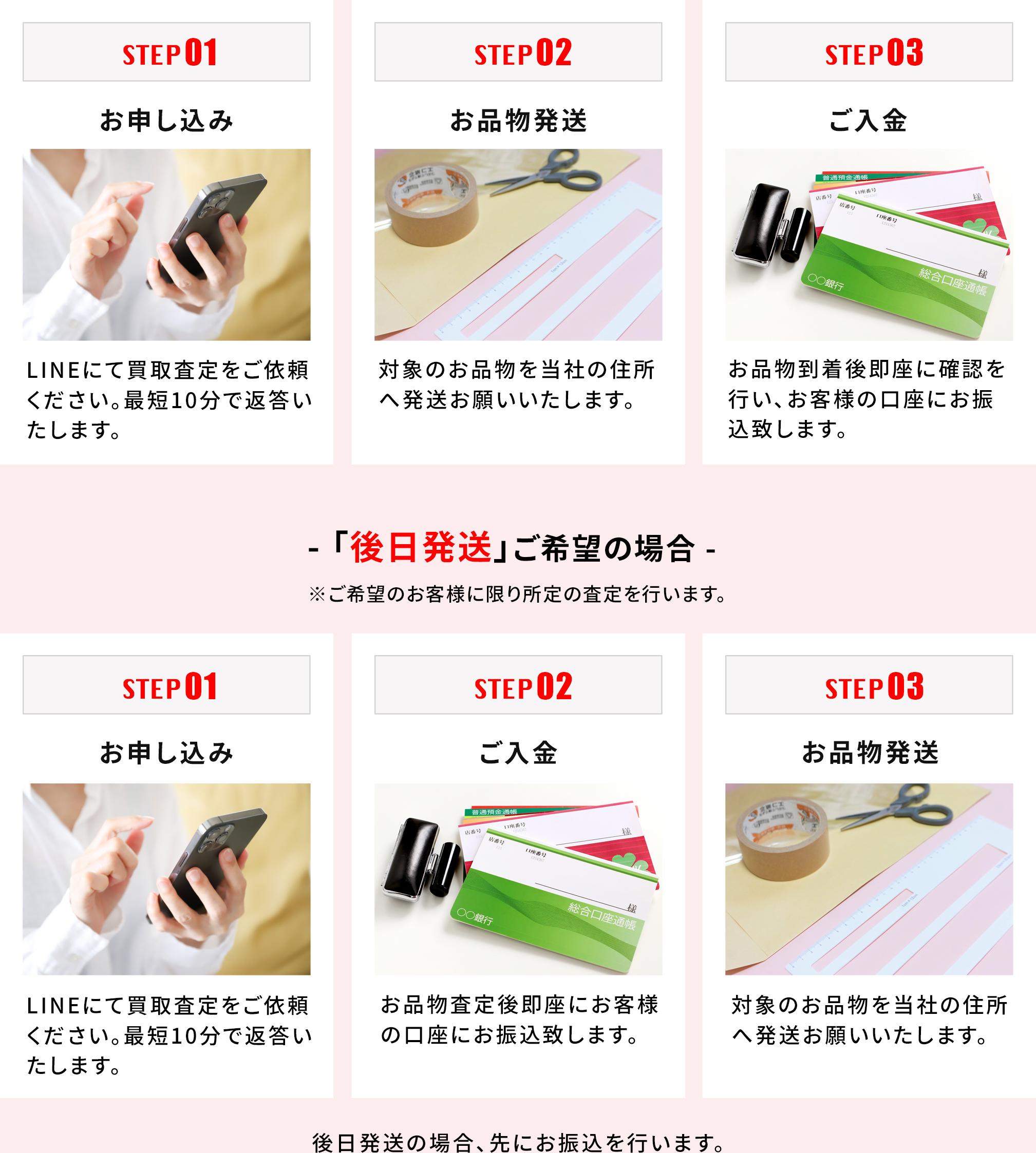 後日郵送とは、原則としては商品を先に送っていただき買取代金の査定と支払をするところ、商品の種類などによっては先に買取代金を支払い、後日に商品を郵送で送ることで大丈夫という仕組みです。そのため、弊社基準の簡単な確認を行います。確認〜査定は最短10分程度です。時間帯や申込みの多い時期では、確認〜査定の時間が長くなる場合があります。【※お手元に商品がある場合のみ後日発送が利用可能です。】